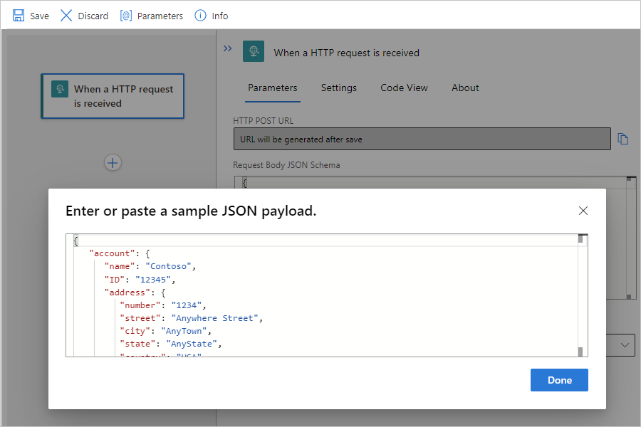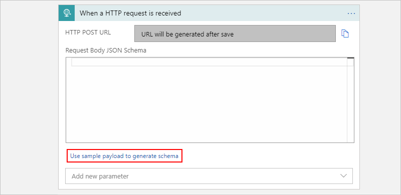 如果没有 JSON 架构,可以使用“使用示例有效负载生成架构”功能从示例有效负载生成此架构。