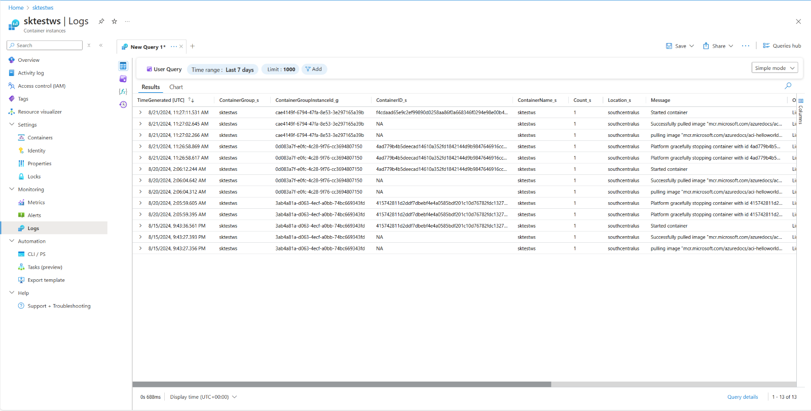 你还可以通过导航到左侧窗格中的“容器”,然后在中间窗格中选择“日志”来查看容器实例的日志。