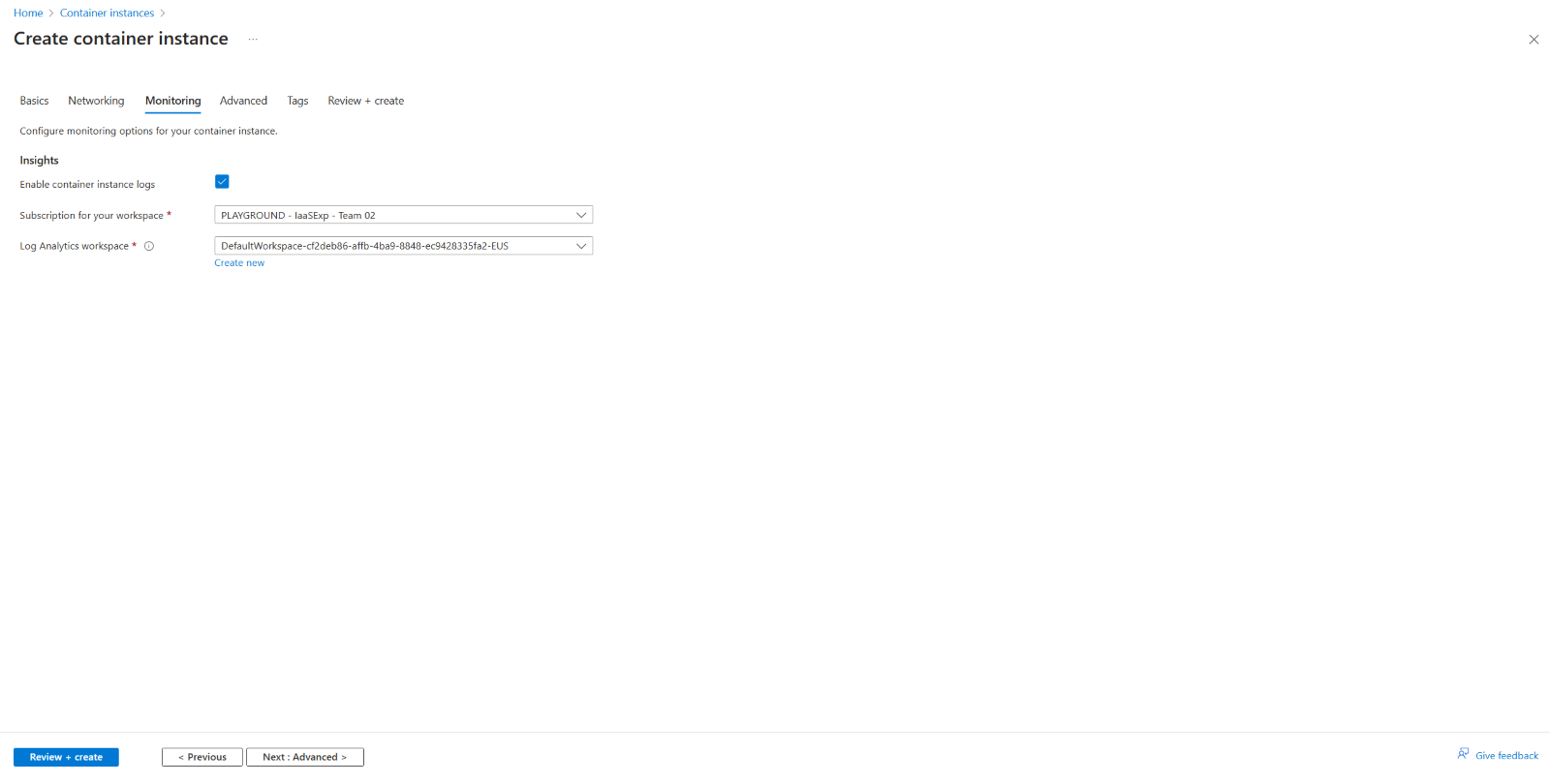 - 如果创建了未启用 Log Analytics 的容器实例,则会看到此屏幕并且能够启用它。