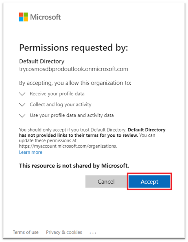 8. 在弹出窗口中选择 “接受” 以访问试用 Azure Cosmos DB 帐户。