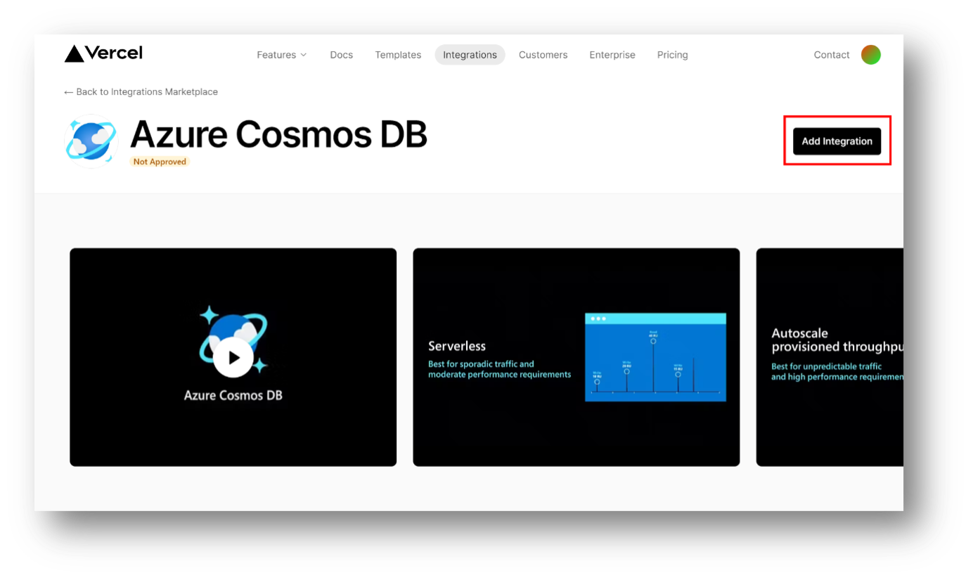 显示 Vercel 市场上的 Azure Cosmos DB 集成页的屏幕截图。