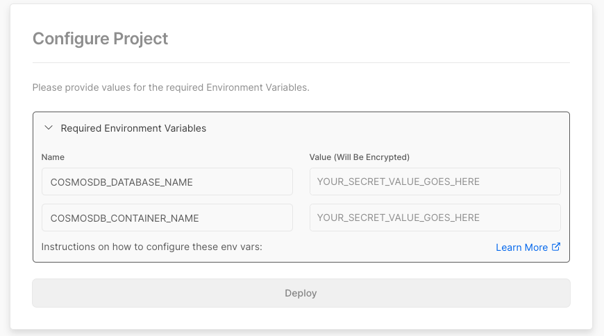 • COSMOSDB_CONTAINER_NAME - 计划使用的容器的名称。 此值应已存在于上一个数据库中。