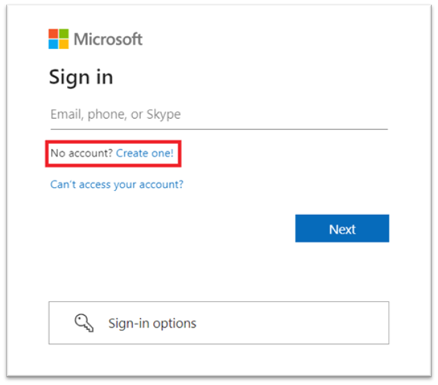 3. 登录到现有的 Microsoft 帐户,或者如果没有帐户,请按照下一步所述创建一个新帐户。