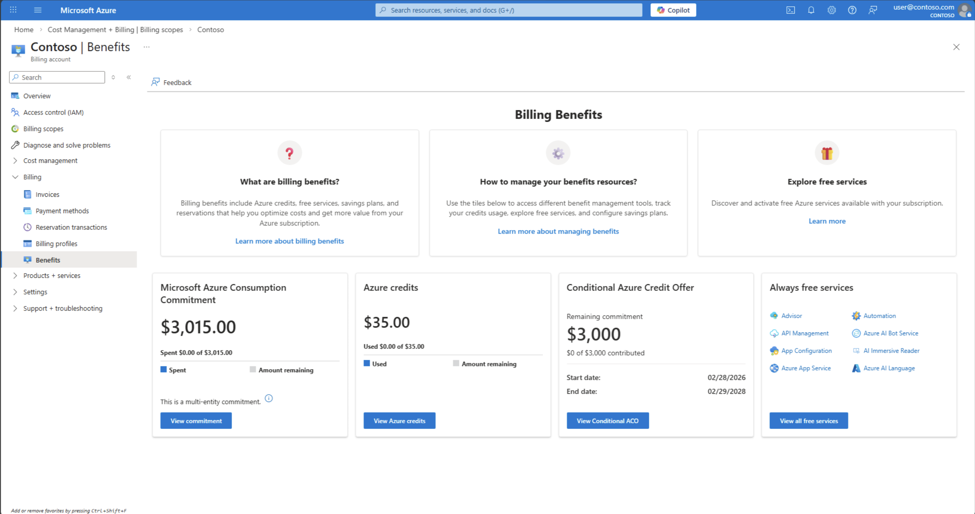 显示 Microsoft 客户协议计费权益的屏幕截图,包括 Azure 消耗承诺的磁贴。