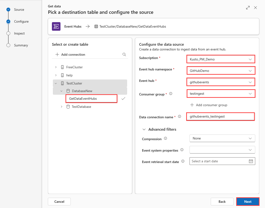 设置 字段说明 订阅 事件中心资源所在的订阅 ID。 事件中心命名空间 标识你的命名空间的名称。 事件中心 需要的事件中心 使用者组 你的事件内定义的使用者组 数据连接名称 标识你的数据连接的名称。 高级筛选器 压缩 事件中心消息有效负载的压缩类型。 事件系统属性 事件中心系统属性。 如果每个事件消息有多个记录,则系统属性将添加到第一个记录中。 添加系统属性时,创建或更新表架构和映射以包括所选属性。 事件检索开始日期 数据连接将检索在“事件检索开始日期”之后创建的事件中心事件。 只能检索按照事件中心保留期保留的事件。 如果未指定“事件检索开始日期”,则默认时间是创建数据连接的时间。 选择“下一步”