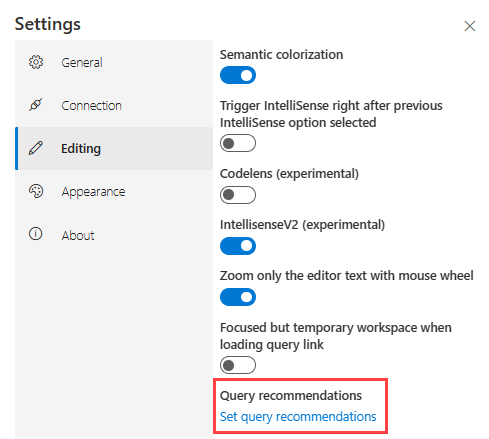 编写查询时,查询编辑器会提供建议和警告。 建议和警告可能与性能、正确性或常规最佳做法相关。 若要自定义建议和警告,请执行以下步骤: