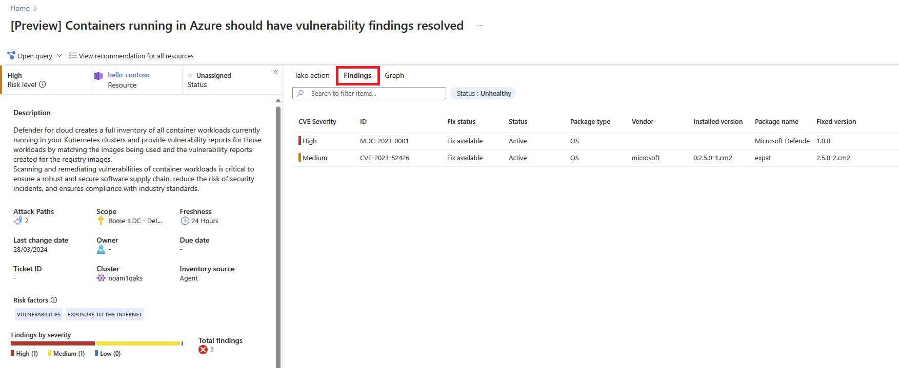 如果使用 Defender CSPM,请先查看并修正通过攻击路径暴露的漏洞,因为它们对安全状况构成最大的风险。 然后,使用以下过程查看、修正、确定优先级并监视容器的漏洞。