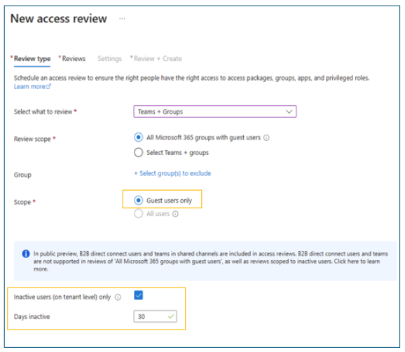 “ 新建访问评审 ”对话框,其中突出显示了 “审阅类型 ”选项卡和来宾用户选项。