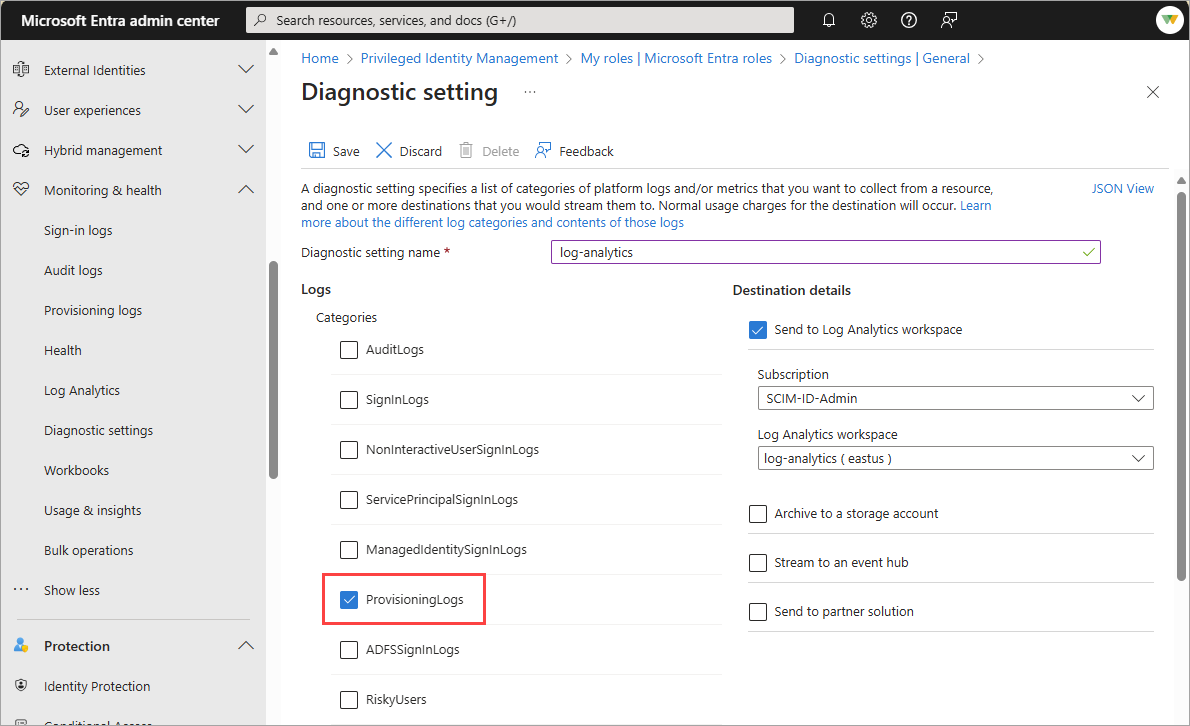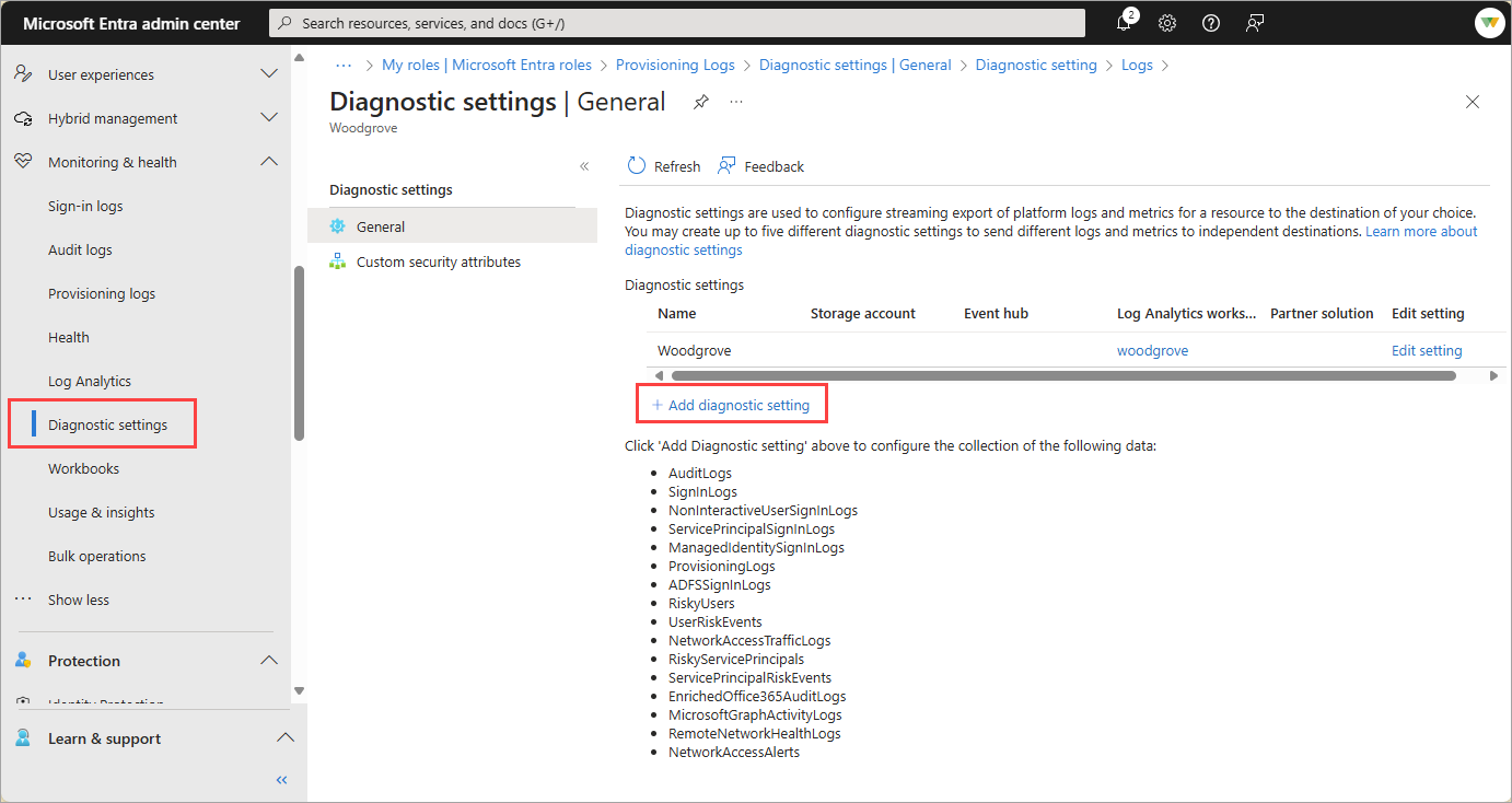 浏览到 Entra ID>监视和运行状况>诊断设置。
