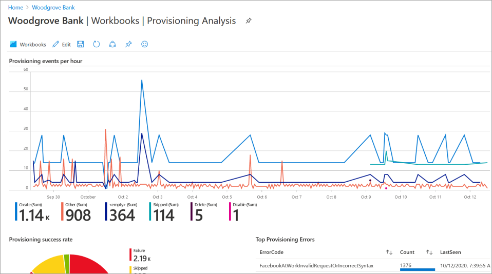 Microsoft Entra 标识工作簿提供灵活的画布用于数据分析。 他们还提供在 Azure 门户中创建丰富的视觉报表。 若要了解详细信息,请参阅 Microsoft Entra 工作簿。