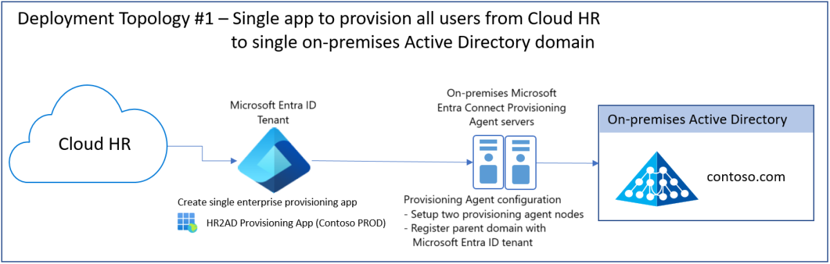 Microsoft Entra Connect 预配代理部署拓扑取决于你计划集成的云 HR 应用租户和 Active Directory 子域的数量。 如果有多个 Active Directory 域,它取决于 Active Directory 域是连续的还是非连续的。