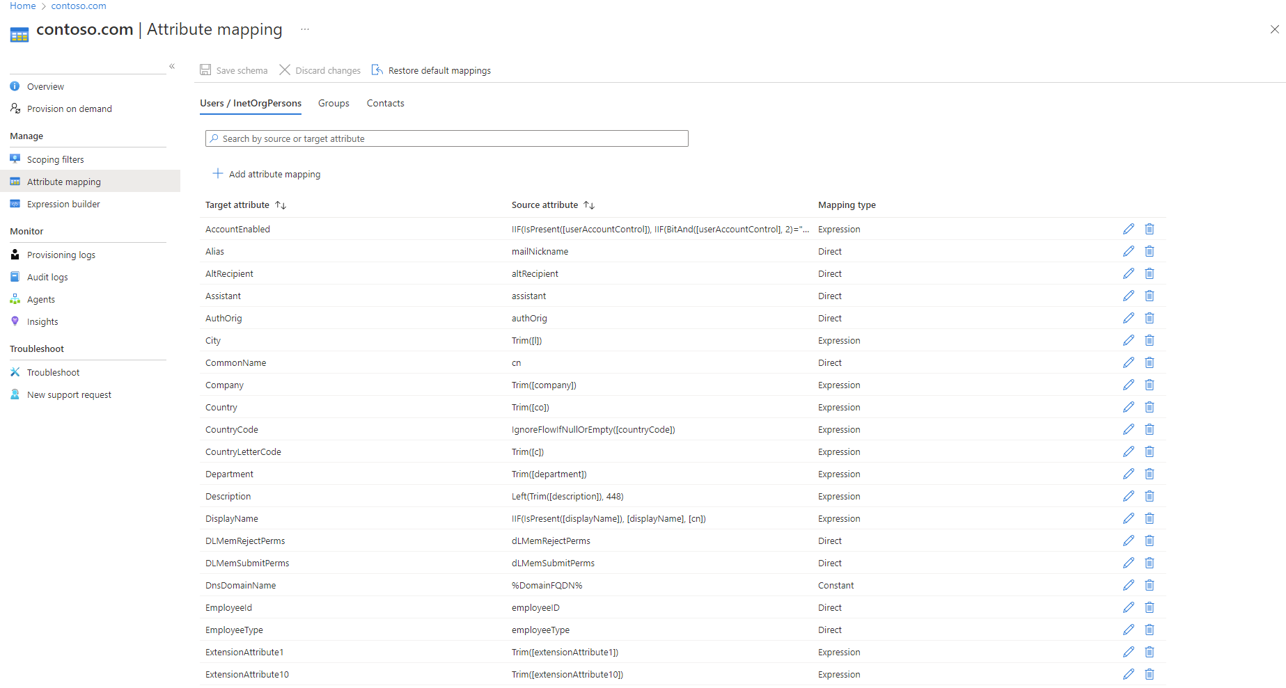 除这些基本类型以外,自定义特性映射还支持可选的默认值赋值概念。 默认值赋值确保当 Microsoft Entra ID 或目标对象没有值时,使用某个值来填充目标特性。 最常见的配置是将此项留空。