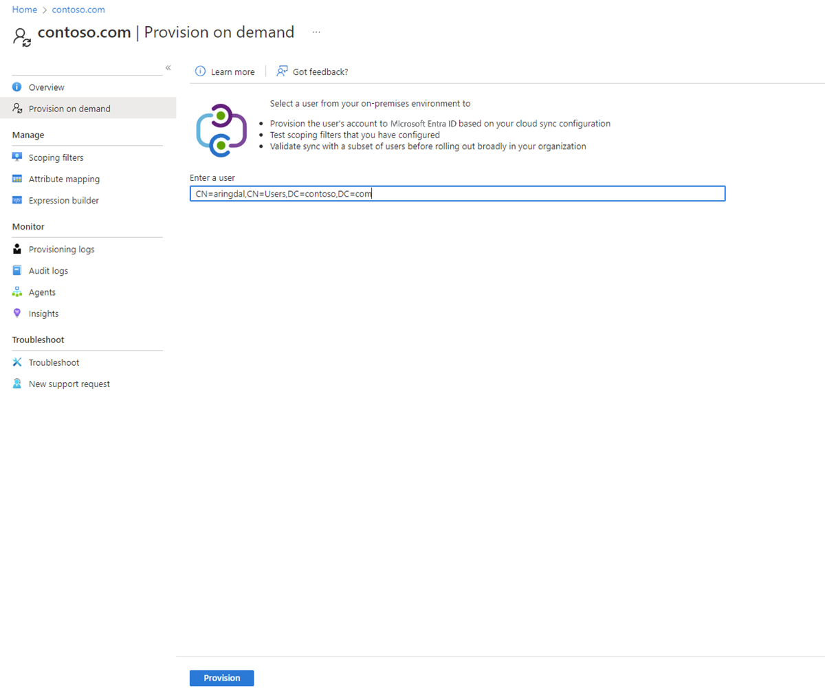 3. 输入用户的可分辨名称,然后选择“预配”按钮。