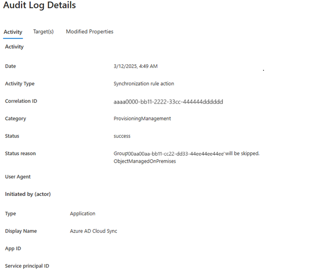 • 可以在审核日志中验证此对象不会发生同步,因为它在本地托管。