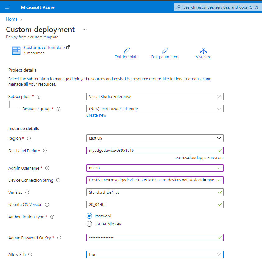 password:az deployment group create \ --resource-group IoTEdgeResources \ --template-uri "https://raw.githubusercontent.com/Azure/iotedge-vm-deploy/main/edgeDeploy.json" \ --parameters dnsLabelPrefix='my-edge-vm1' \ --parameters adminUsername='<REPLACE_WITH_USERNAME>' \ --parameters deviceConnectionString=$(az iot hub device-identity connection-string show --device-id <REPLACE_WITH_DEVICE-NAME> --hub-name <REPLACE-WITH-HUB-NAME> -o tsv) \ --parameters authenticationType='password' \ --parameters adminPasswordOrKey="<REPLACE_WITH_SECRET_PASSWORD>"若要使用 SSH 密钥进行身份验证,请将 authenticationType 指定为 ,然后在 adminPasswordOrKey 参数中提供 SSH 密钥的值。