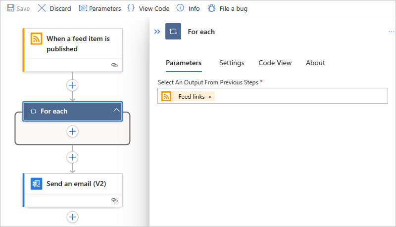 以下示例工作流会发送网站 RSS 源的每日摘要。 该工作流使用“For each”操作,它会为每个新项发送电子邮件。