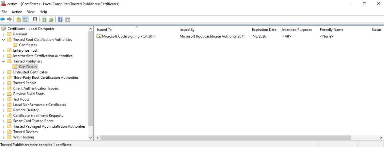 在证书管理器中,必须能够看到“Microsoft 根证书颁发机构 2011”和“Microsoft 代码签名 PCA 2011”的条目。