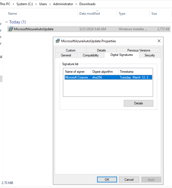 选择“详细信息”并检查证书的“数字签名信息”是否为“正常”,如以下屏幕截图中所突出显示: