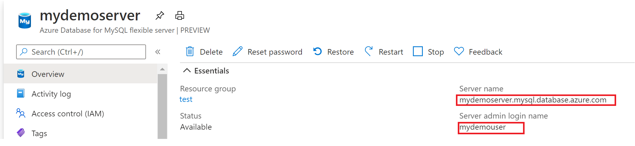 - 从服务器的“概览”面板中记下“服务器名称”和“服务器管理员登录名”。 如果忘记了密码,也可通过此面板来重置密码。