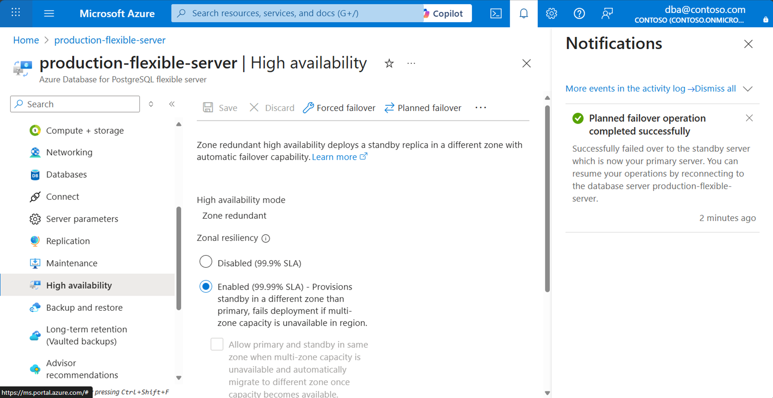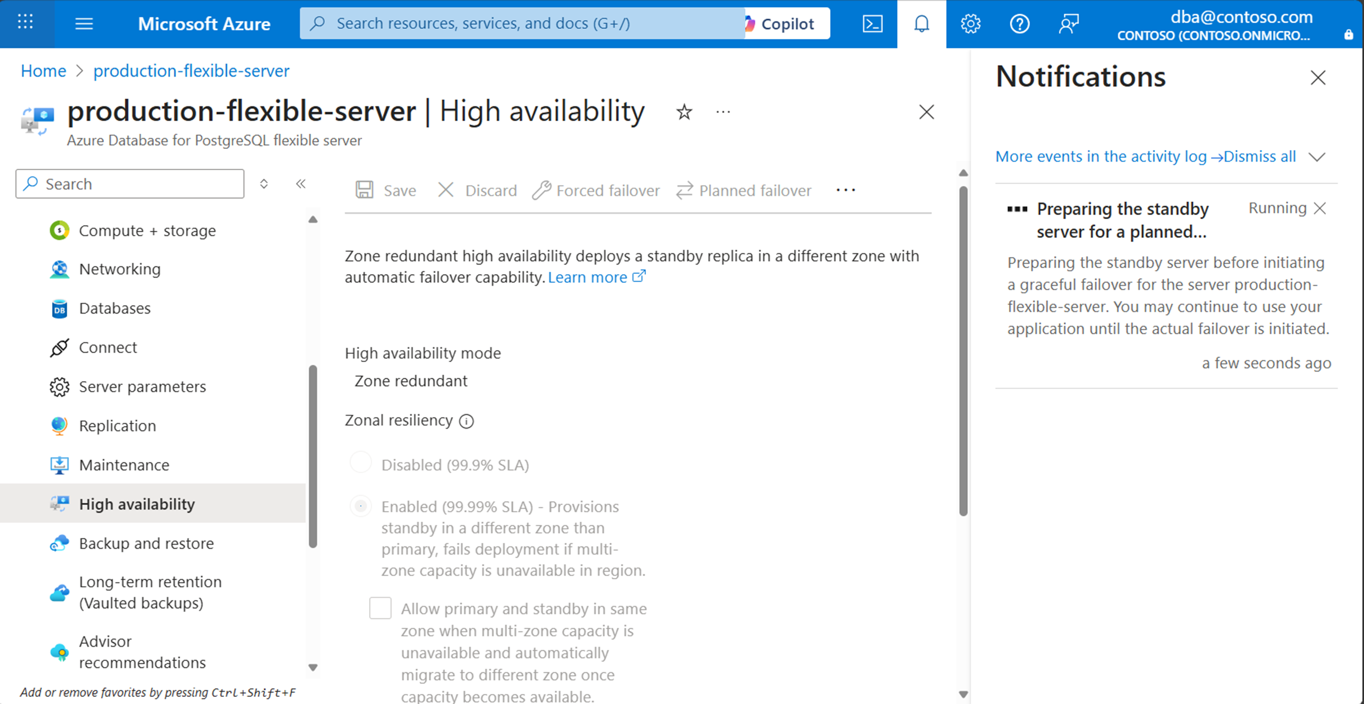 按照以下步骤执行从主服务器到 Azure Database for PostgreSQL 中的备用服务器的计划内故障转移。 启动此作会准备备用服务器,然后执行故障转移。