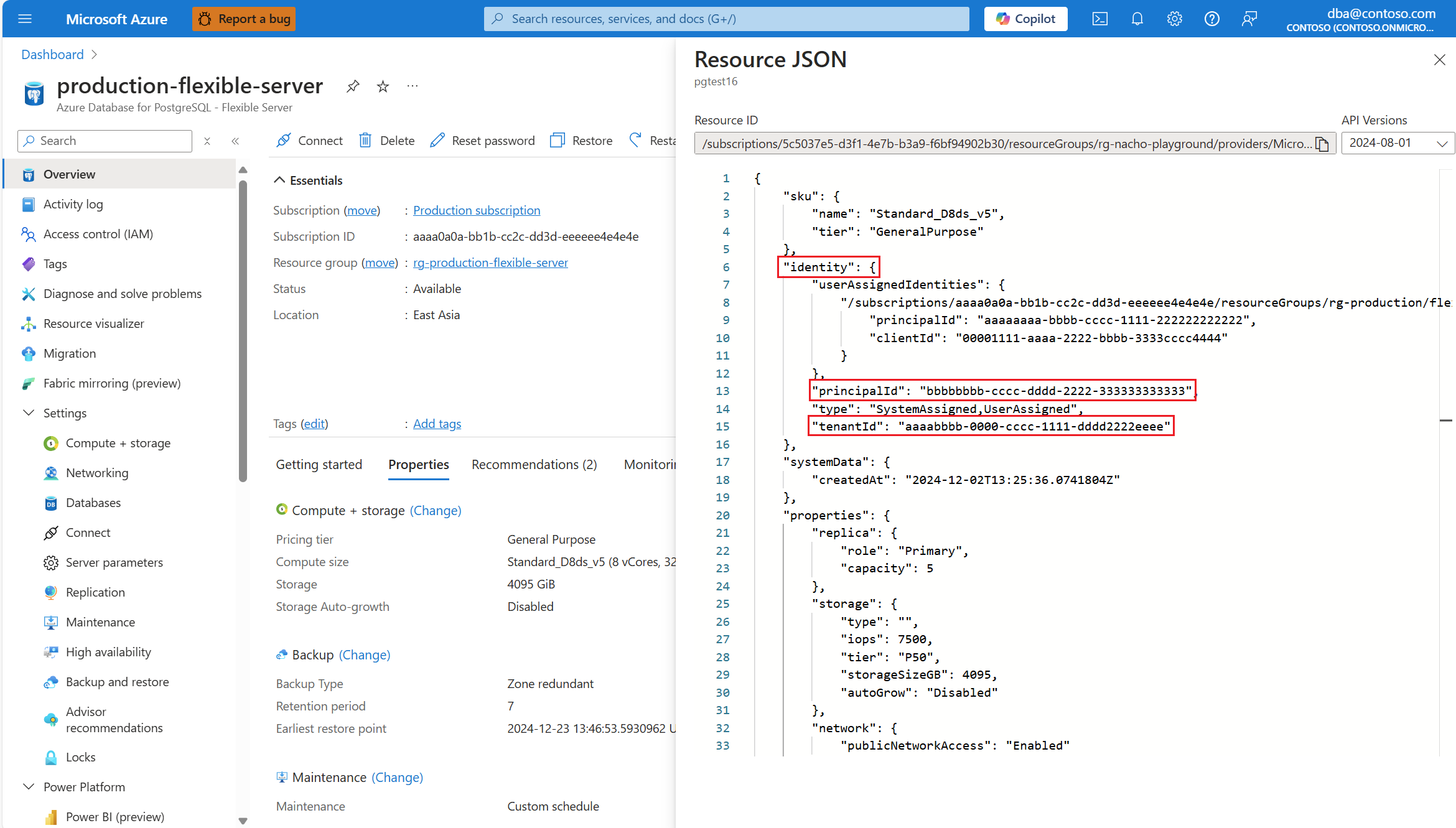 在打开的资源 JSON 面板中,找到标识属性,并在其中找到系统分配的托管标识的 principalId 和 tenantId。