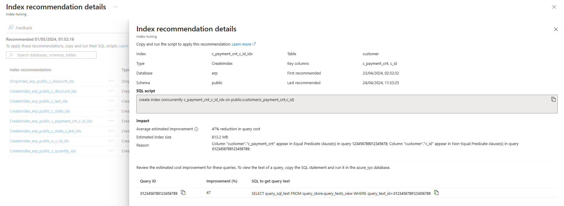 "id": "/subscriptions/<subscription_id>/resourceGroups/<resource_group>/providers/Microsoft.DBforPostgreSQL/flexibleServers/<server>/tuningOptions/index/recommendations/<recommendation_id>",