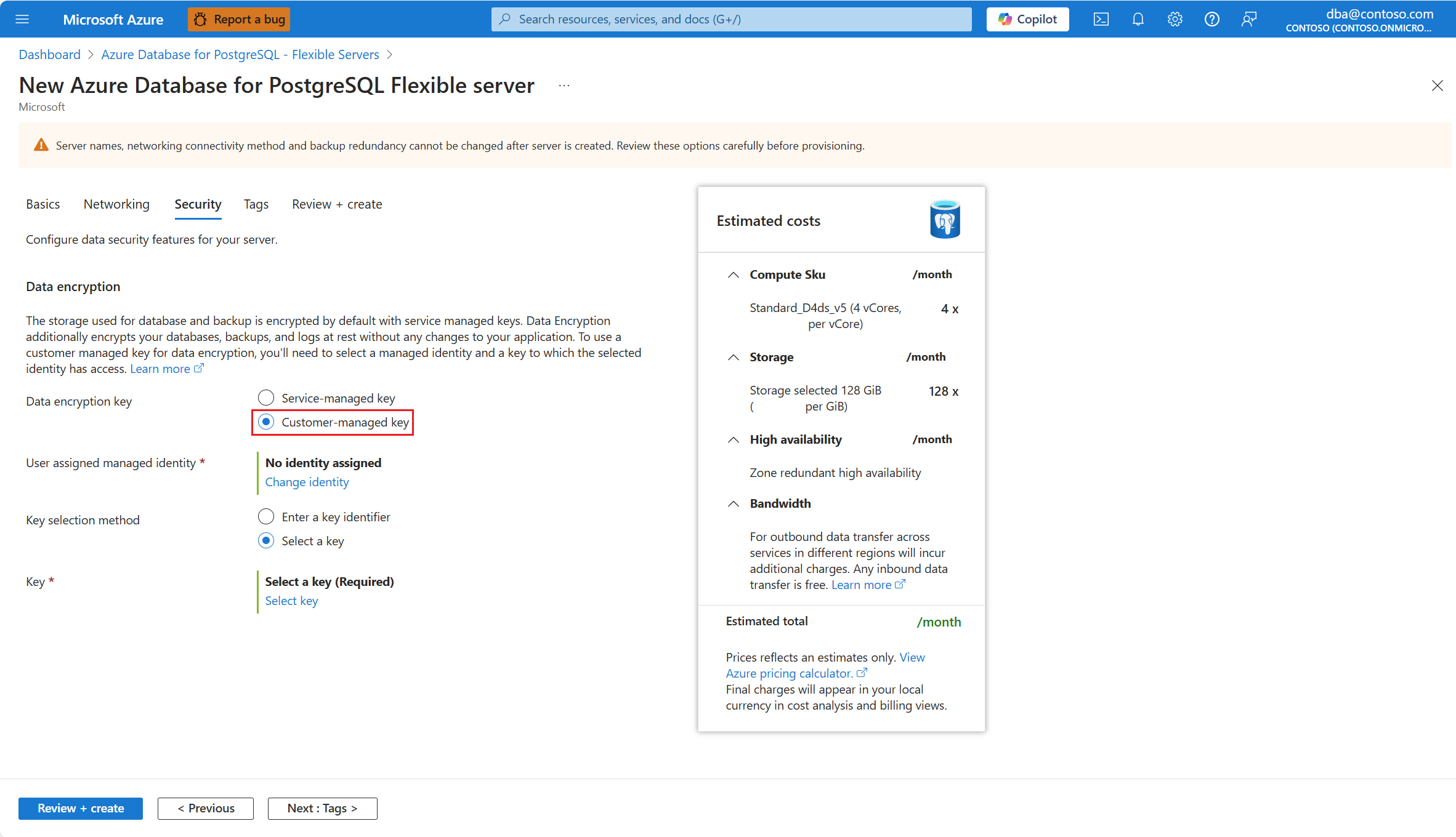 在预配新的 Azure Database for PostgreSQL 灵活服务器实例期间,数据加密在 “安全 ”选项卡中进行配置。对于 数据加密密钥,请选择 “客户管理的密钥 ”单选按钮。