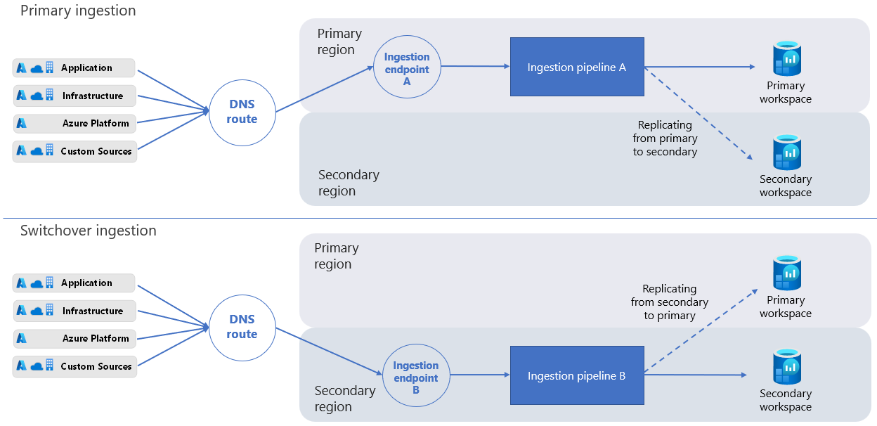切换过程更改工作区的 DNS 条目后,辅助工作区可用于引入和查询。 Azure的代理自动重试失败的日志引入尝试。 使用日志引入 API 的应用程序还应重试。