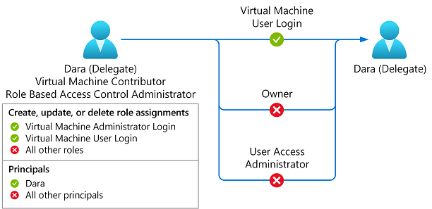 此条件允许委托仅添加或删除 虚拟机管理员登录 角色或 虚拟机用户登录 角色的角色分配。 此外,委托只能将这些角色分配给名为 Dara 的特定用户(ea585310-c95c-4a68-af22-49af4363bbb1)。