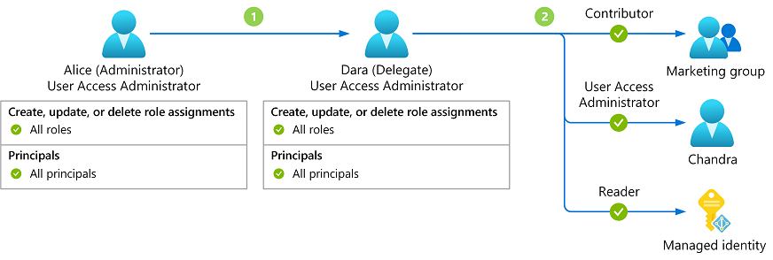 下图显示了 Alice 如何将角色分配职责委托给 Dara。 有关具体步骤,请参阅将用户分配为 Azure 订阅的管理员。