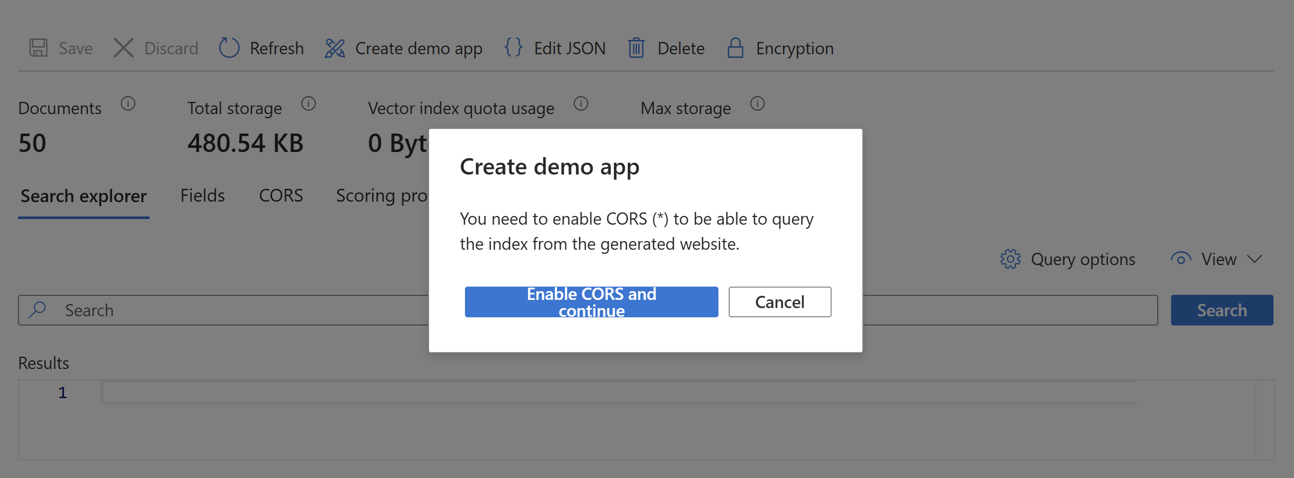 选择 “启用 CORS”并继续 向索引定义添加 CORS 支持。