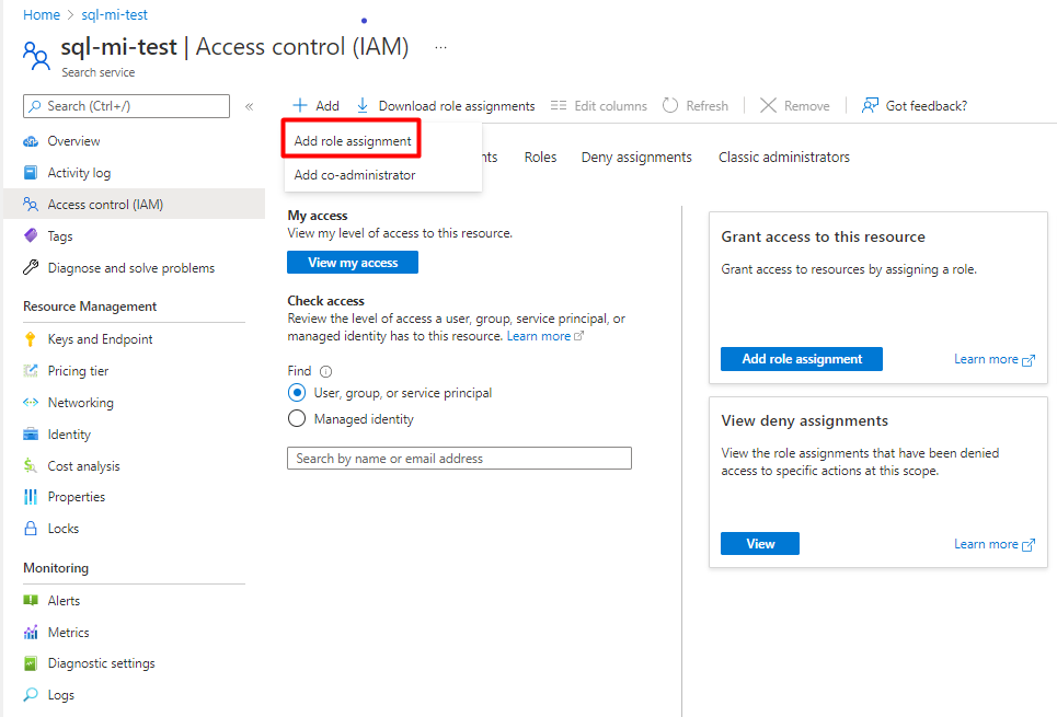 在此步骤中,为 Azure AI 搜索服务授予从 SQL 托管实例读取数据的权限。