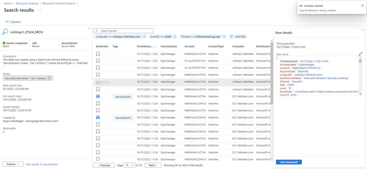 在查看搜索作业结果时,可以选择“添加书签”或选择书签图标以保存某行。 添加书签可以标记事件、添加笔记,并将这些事件附加到某个事件供以后参考。