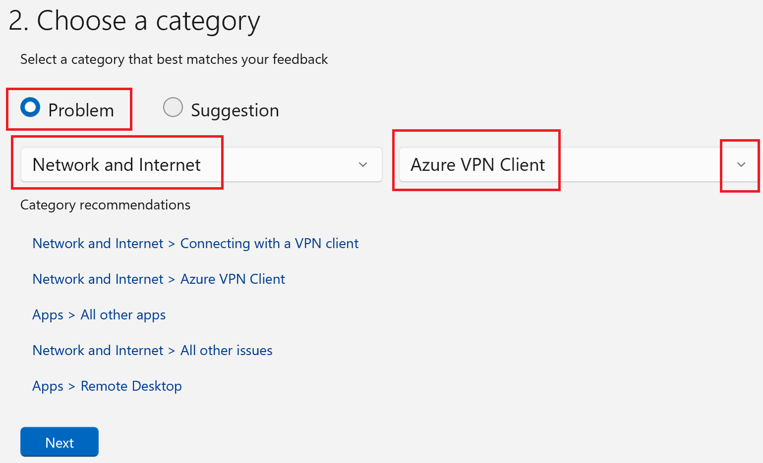 在“选择类别”下,选择这是一个“问题”还是一个“建议”。