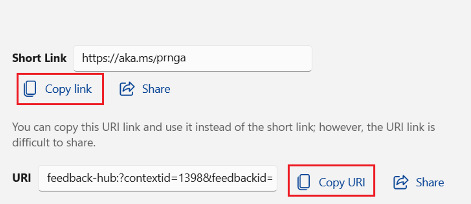 选择“其他共享选项”以访问与发送到 Microsoft 的诊断日志关联的 URI。