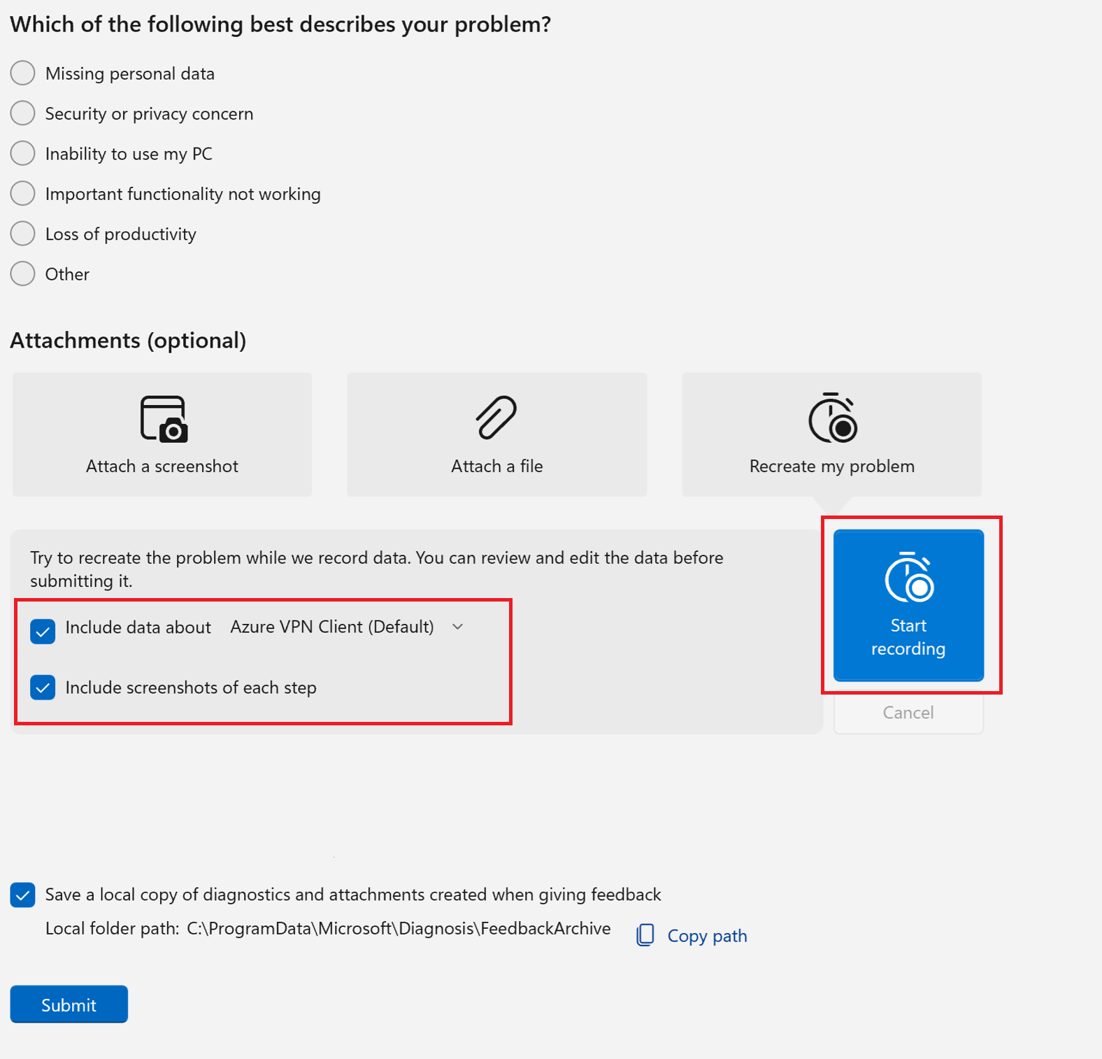 本文帮助你使用反馈中心应用报告 Azure VPN 客户端问题或改进 Azure VPN 客户端体验。 使用本文中的步骤,帮助收集日志、发送文件和屏幕截图并查看诊断。 本文中的步骤适用于 Windows 10 和 Windows 11 操作系统以及 Azure VPN 客户端。